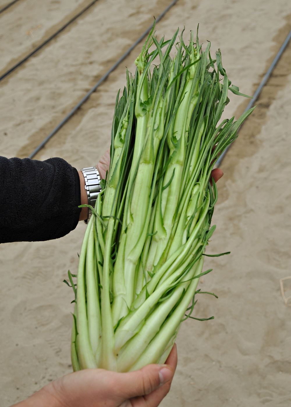 'Gaetano' is our friends' at Smarties.bio first foray into a selection of the Roman type. While less uniform in heading, the longer slender stems are more delicate and tender and better suited to the traditional preparation of match-sticking and soaking in cold water to gain the distinctive curl for salad use. It comes on slightly earlier than Medusa and is not quite as winter hardy. We feel as though both types have their place in creating a complete program to maximize puntarelle enjoyment each fall.