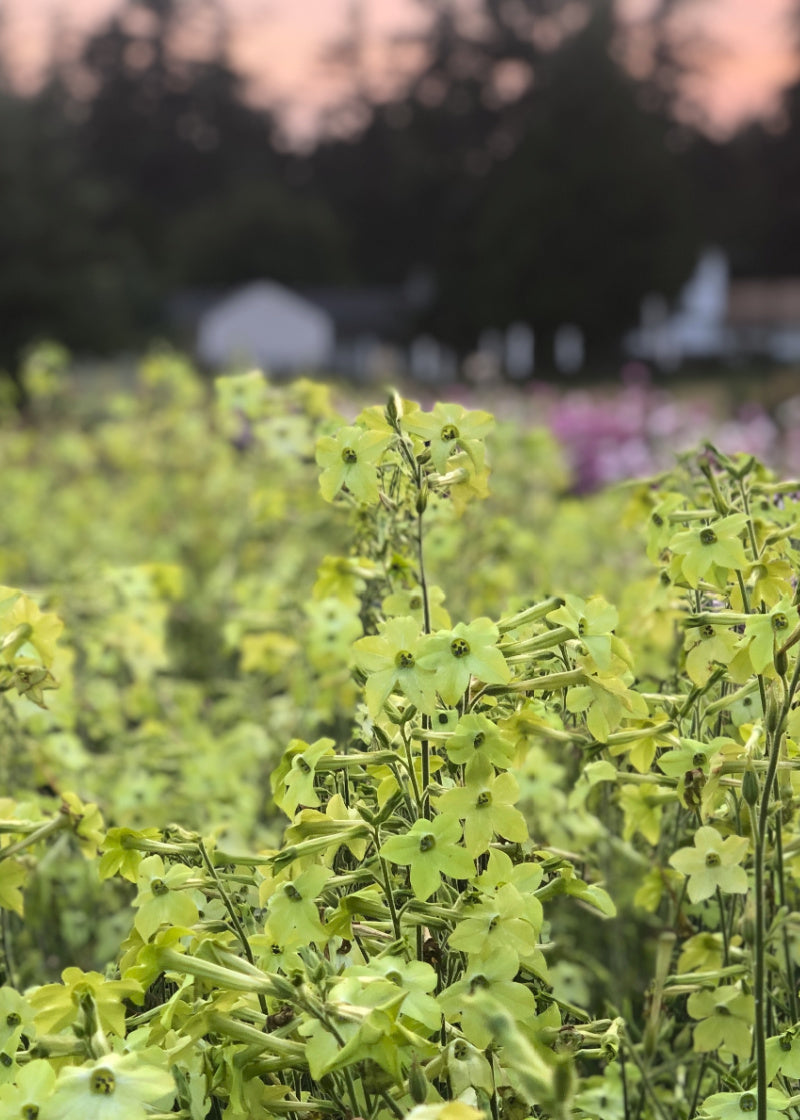 (Nicotiana alata) Velvety green tobacco leaves give rise to flower spikes of nodding chartreuse trumpet flowers that glow in any light. Add to that the absolutely intoxicating fragrance released into the evening air at dusk and continuing into the morning hours...*sigh* Each plant continually branches reaching a height of 3-4’ and produces masses of flowers. We suggest you plant a hedge…you will not be disappointed! A versatile cut flowers for arrangements.