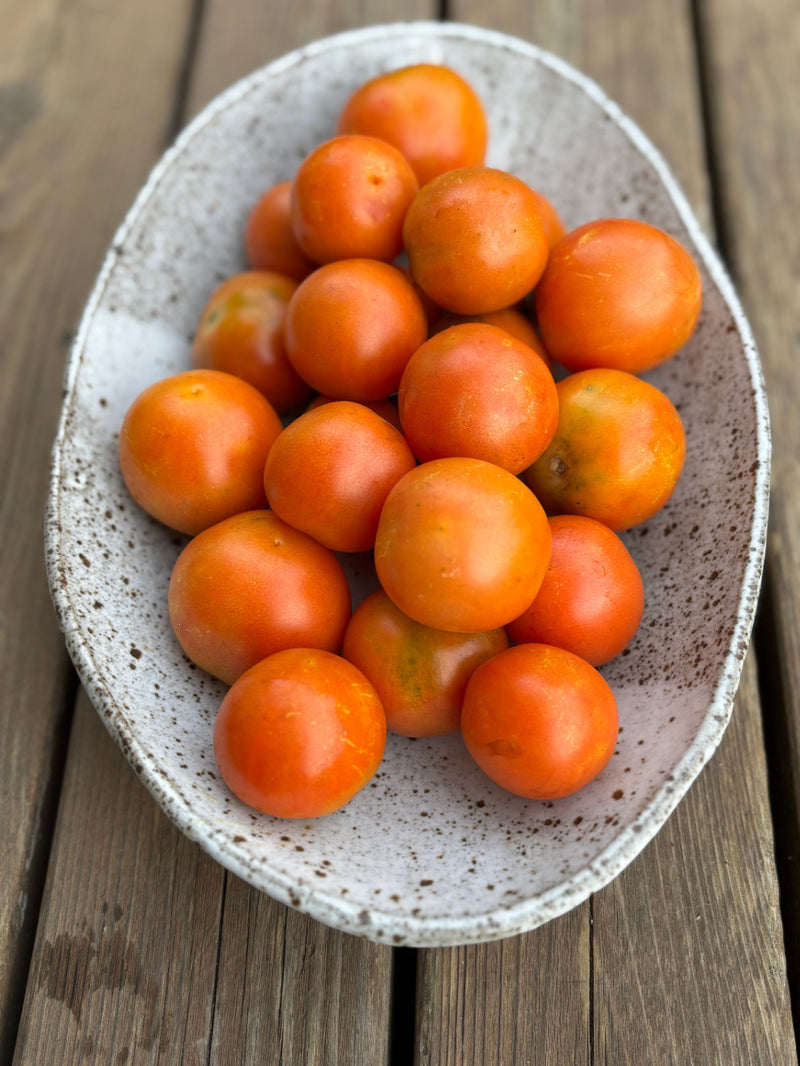 (Lycopersicon esculentum) Crispiano is a unique and wonderful storage tomato hailing from the town of the same name in the province of Taranto in southern Italy's Puglia region. Amusingly, it is a very firm (borderline crunchy) tomato, giving the name an extra layer of appropriateness. Selected for many years by farmers of the area for qualities that allow it to store well into the winter months, it is one of the most durable tomatoes we have grown. The fruits are slow to mature on indeterminate vines and never quite look or feel ripe to the touch, shifting from yellow with green streaked shoulders to an orange/red blush (giallorosso means yellow-red in Italian). Traditionally stored in single layers in wooden crates or hung in clusters ("Nzerte") similar to Piennoli, they can last for months after harvest in the right conditions. The flavor is defined by classic, very high acidity, a firm and toothsome flesh, and a burst of juicy seed/gel center. The context makes sense when considering another food tradition of the region Frise, a twice-baked circular bread that somewhat resembles a sort of bagel-cracker. Since ancient times Frise were also designed for storage, with their crispy texture and a circular shape allowing them to be strung through the center hole in bunches, thus a 'traveler's bread' to workers and fishermen who were away from home for stretches.  Quickly rehydrated with a dip in water they made a substantial meal.  More recently with the tomato as a topping the juice helps soften the bread while the firm flesh coats and seasons the top.